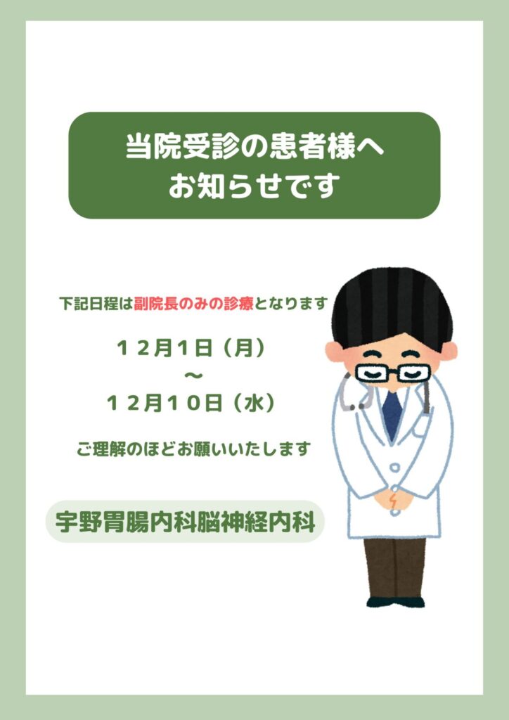 院長が、12月1日(月)~12月10日(水)の10日間、遠方での学会出席のため、副院長のみの診察となります。患者様に於かれましては、長期に渡りご迷惑をおかけいたしますが、ご理解の程よろしくお願いいたします。