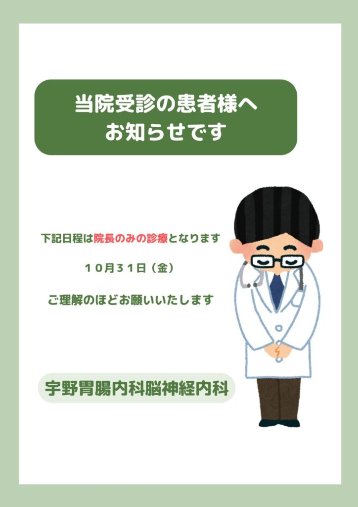 副院長が、10月31日(金)、学会出席のため、院長のみの診療となります。患者様に於かれましては、ご迷惑をおかけいたしますが、ご理解の程よろしくお願いいたします。