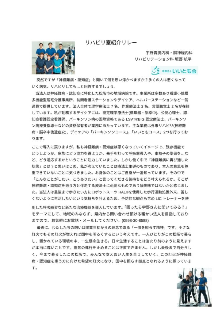 当法人所属理学療法士(以下PT)坂野航平がPT協会11月号『リハビリ室紹介リレー』で、当リハビリテーション科について、紹介記事を執筆させていただきました。PT坂野の人柄が溢れた内容となっております。坂野の想い同様、松阪市内外からもお問合せ頂けるような温かい法人を作っていきたいと思いますので、引き続きよろしくお願いいたします。
