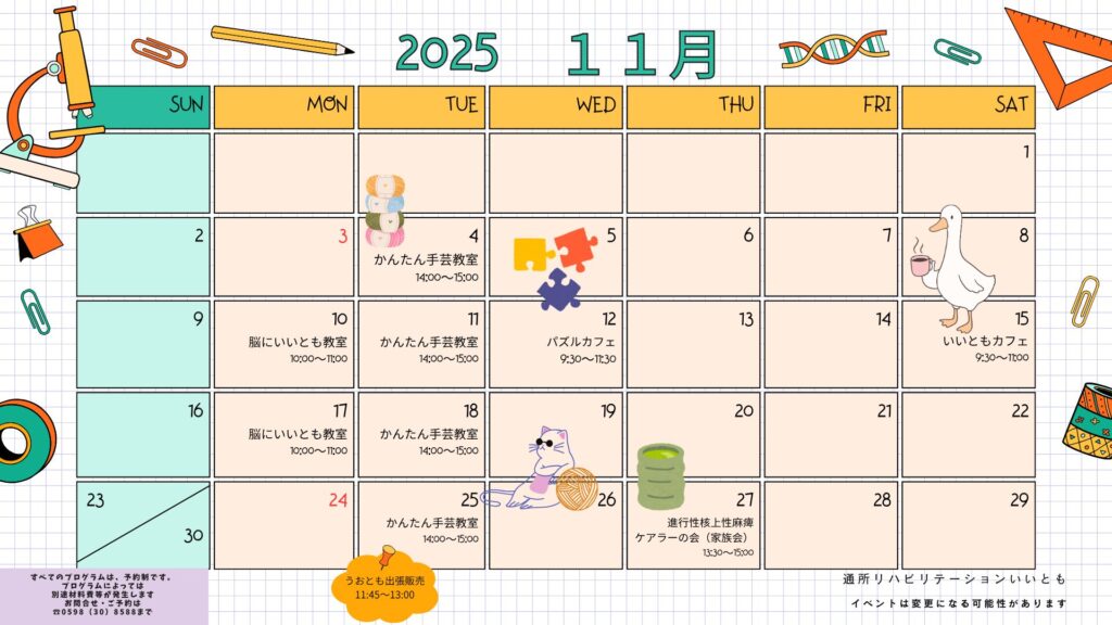 遅くなりましたが、11月のイベントカレンダーを掲載させていただきます。