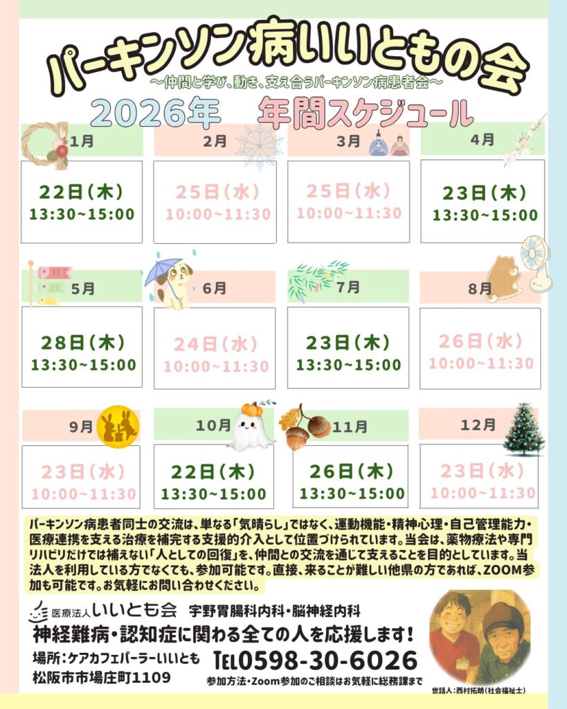 本年1月より、パーキンソン病いいともの会を毎月開催することとなりました。同じ悩みを持つ方々と交流することにより、心が少しでも軽くなればという思いで開催させていただいております。当法人の患者様以外の方も参加可能です。お気軽にお問合せください。