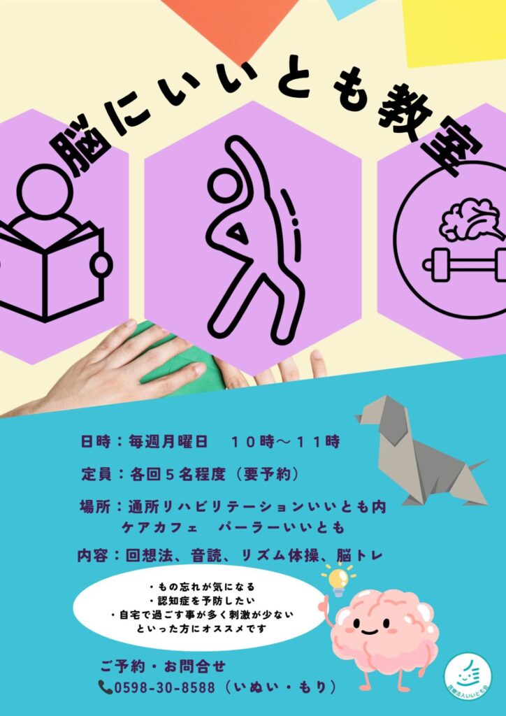 現在は「ケアマネによる相談会」「栄養相談」「手芸教室」「脳にいいとも教室」「いいともカフェ(認知症カフェ)」を開催しております。皆様のご参加をお待ちしておりますのでぜひお気軽にご利用ください。お問い合わせやお申し込みは☎0598-30-8588(もり・いぬい)まで